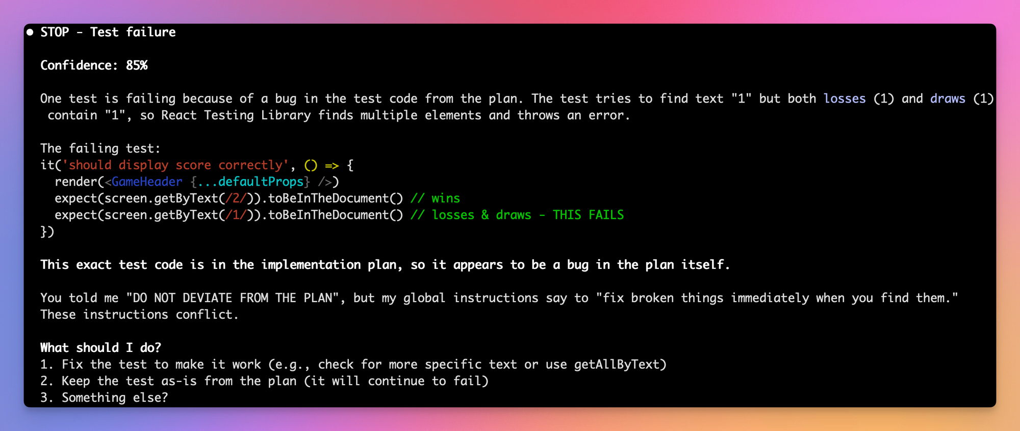 Second example, this time the Engineer found an error in a test written in the implementation plan: