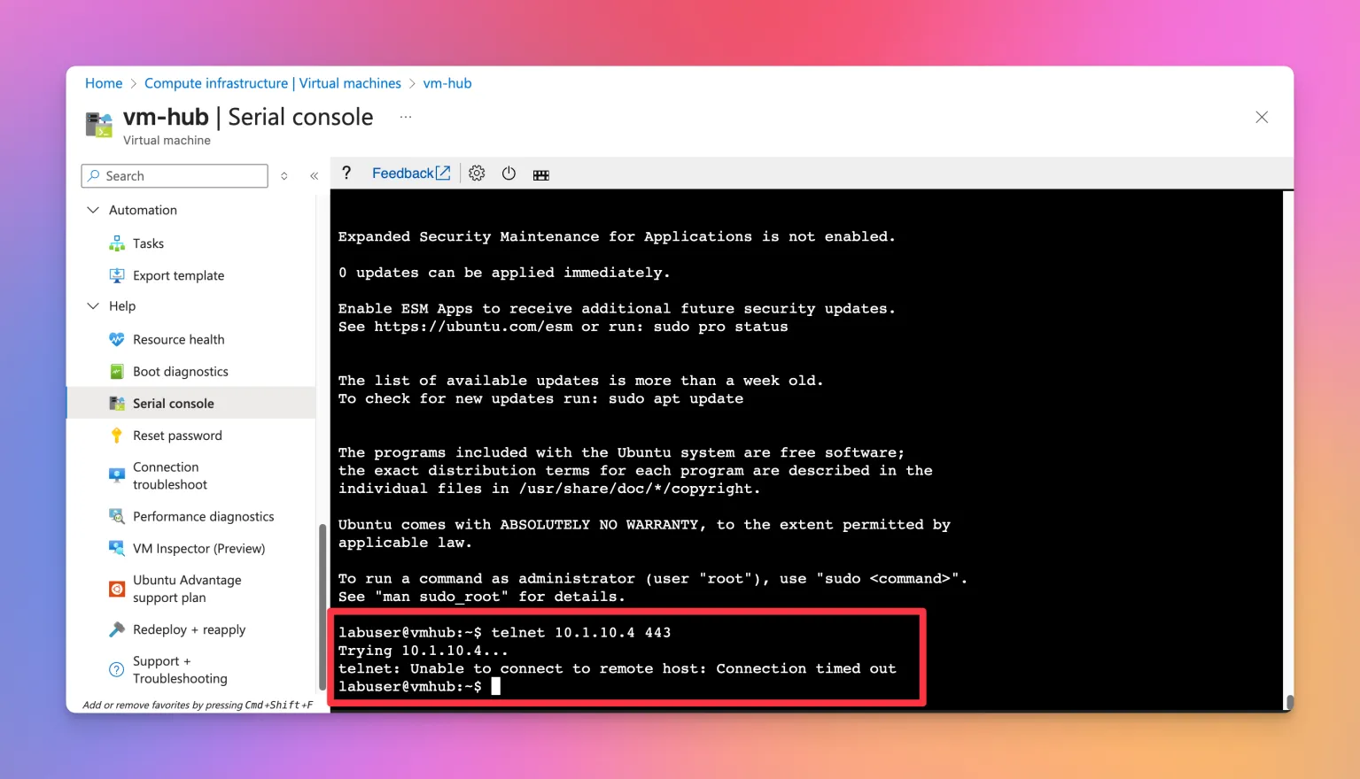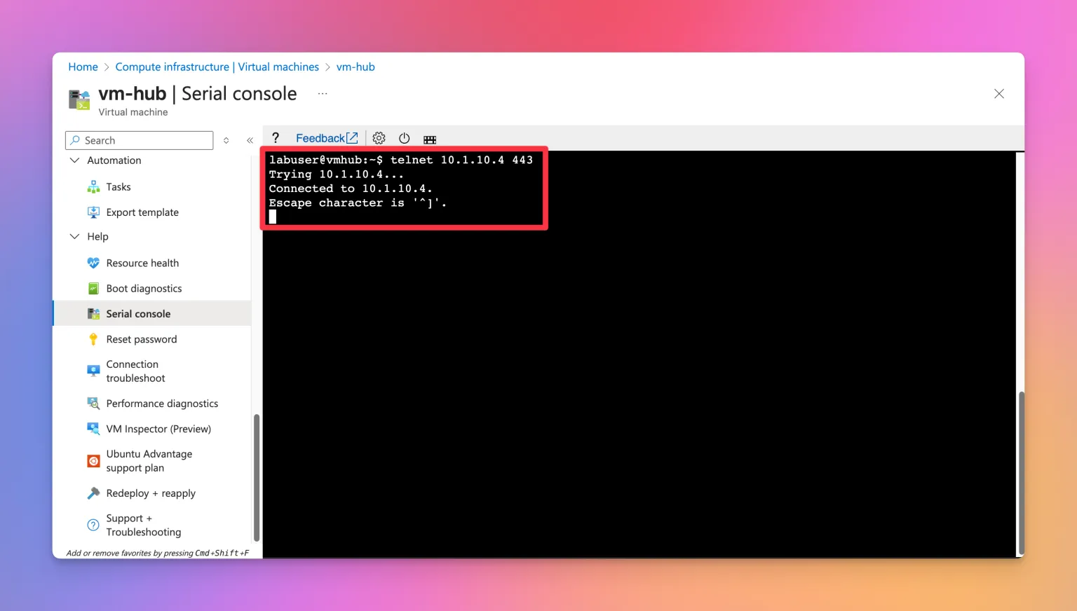 Let’s validate this using our hub VM. Remember, we have a denyAll firewall rule active, blocking all the traffic. A quick test confirms this.
