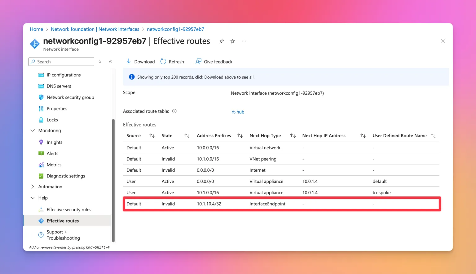 - Allows the use of “effective routes” in the Azure Portal. I find this extremely useful, but the NIC you want to check has to be attached to an VM for this to work