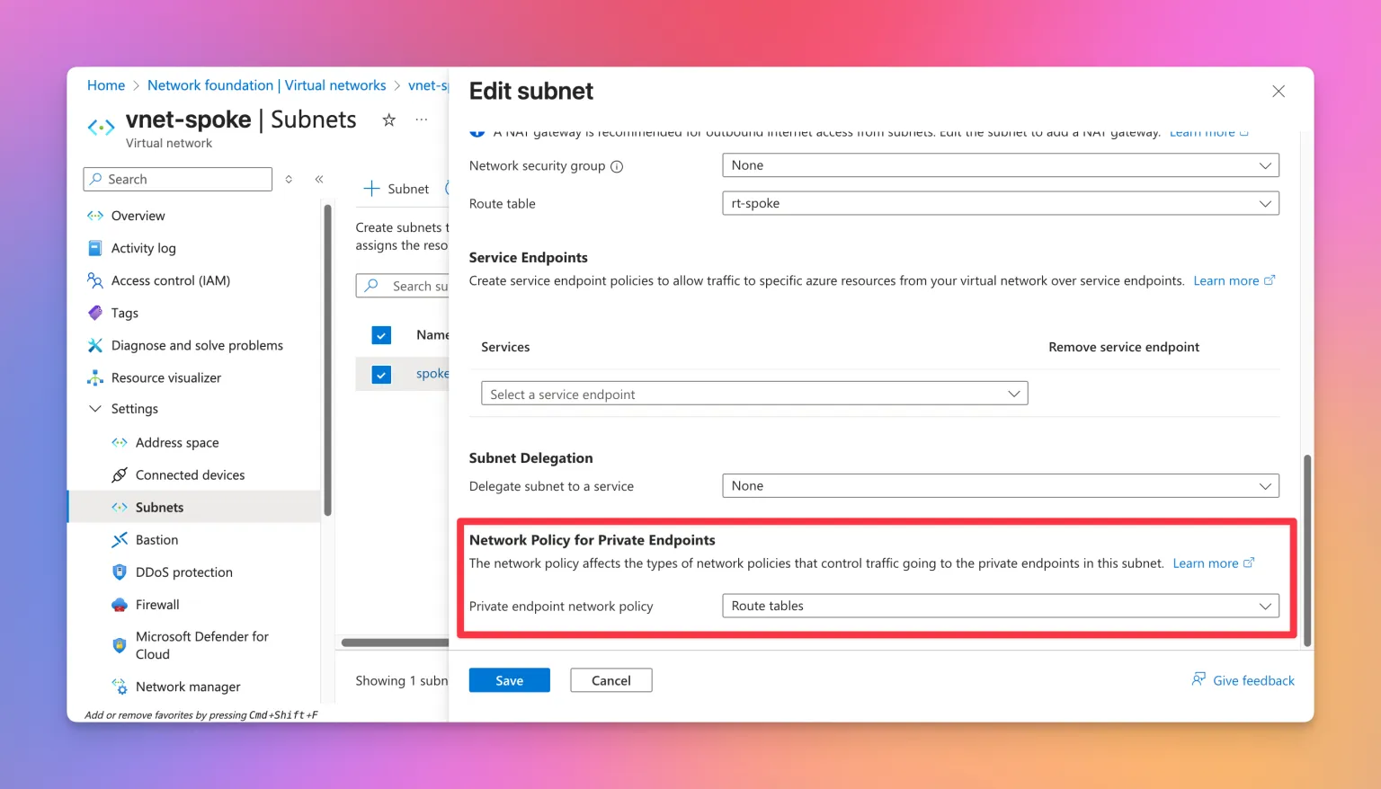 As we’ve seen, by default Network Policies kind of “overrule” route tables and do their own thing. This is where Private Endpoint Network Policies come in. Whenever these are enabled, it basically allows for the /32 routes automatically set by Private Endpoints to be overwritten.