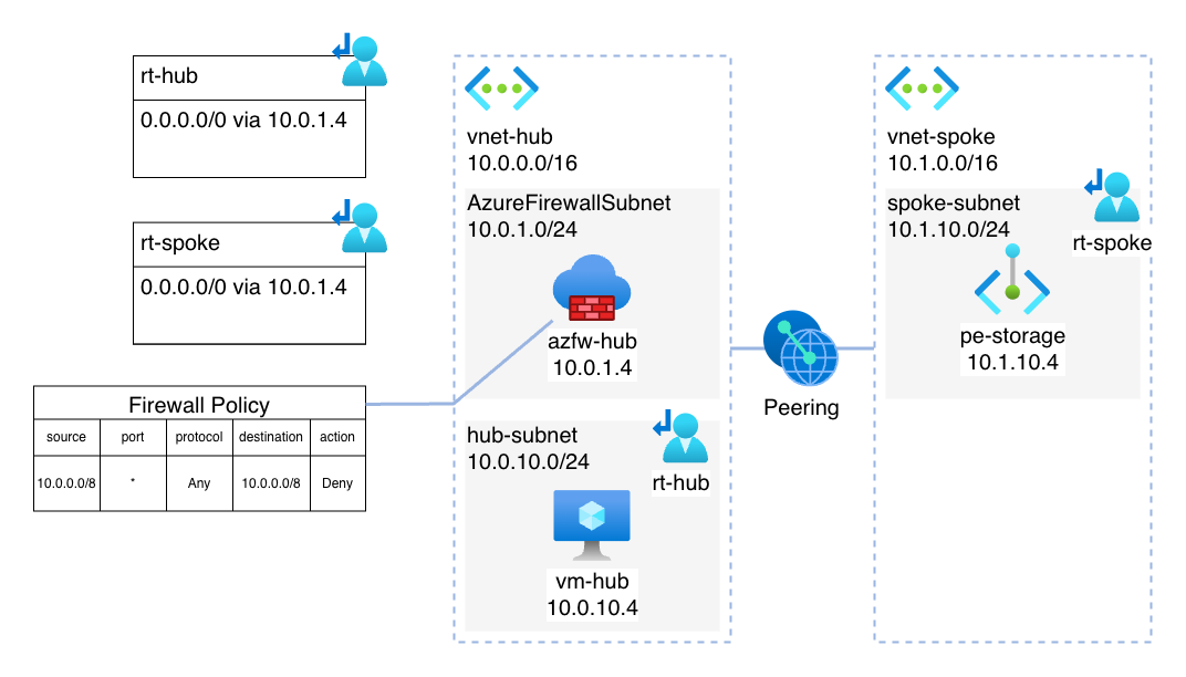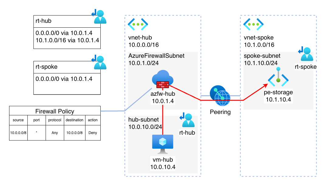 The spoke VNET has one Storage Account with an Private Endpoint. The VNETs are peered to each other. Both workload subnets (in hub and spoke) also have a default route configured via the Azure Firewall.