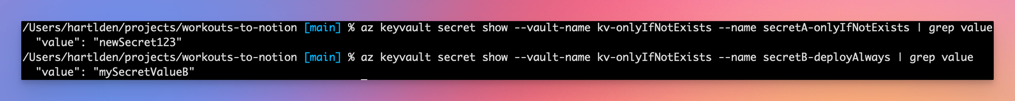 We can see, that the value for secret A persisted, while the value for secret B got reset to the value defined in the Bicep deployment.