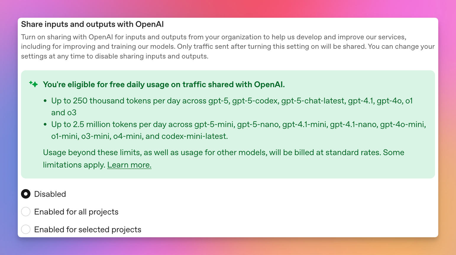 Get daily free tokens for the OpenAI API by enabling data sharing. Learn about eligibility requirements, token limits by model, and the trade-offs you should know before opting in.