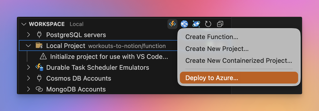 The function app then needs to be deployed manually. I did this from within VSCode. You can also choose to go another route for deployment if you want to.