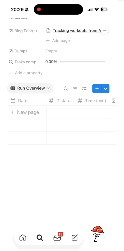 We can see, that we start with an empty Notion database. Once the iOS shortcut gets triggered, it closed the iOS control center, takes a screenshot of the workout, prompts some information, and then sends it off to Azure for processing. After some time, the data gets added as a new entry to the Notion database.