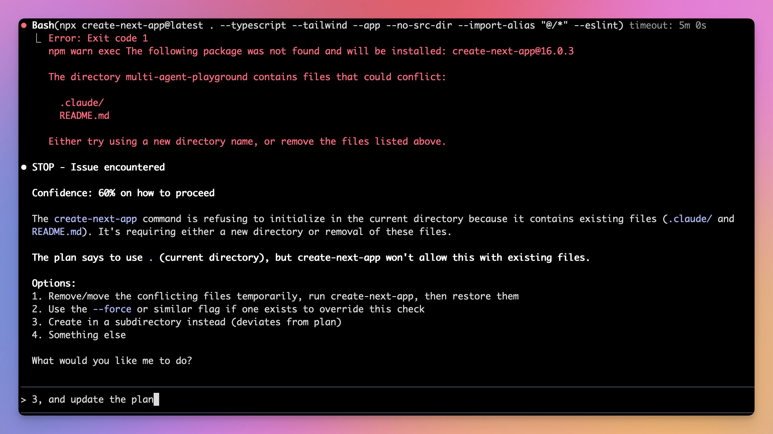 I mentioned that I was skeptical about Claude designing the whole implementation plan for the project before ever implementing anything. And sure enough, the Engineer agent found an ran into an error when initializing the app with NextJS right when starting the implementation: