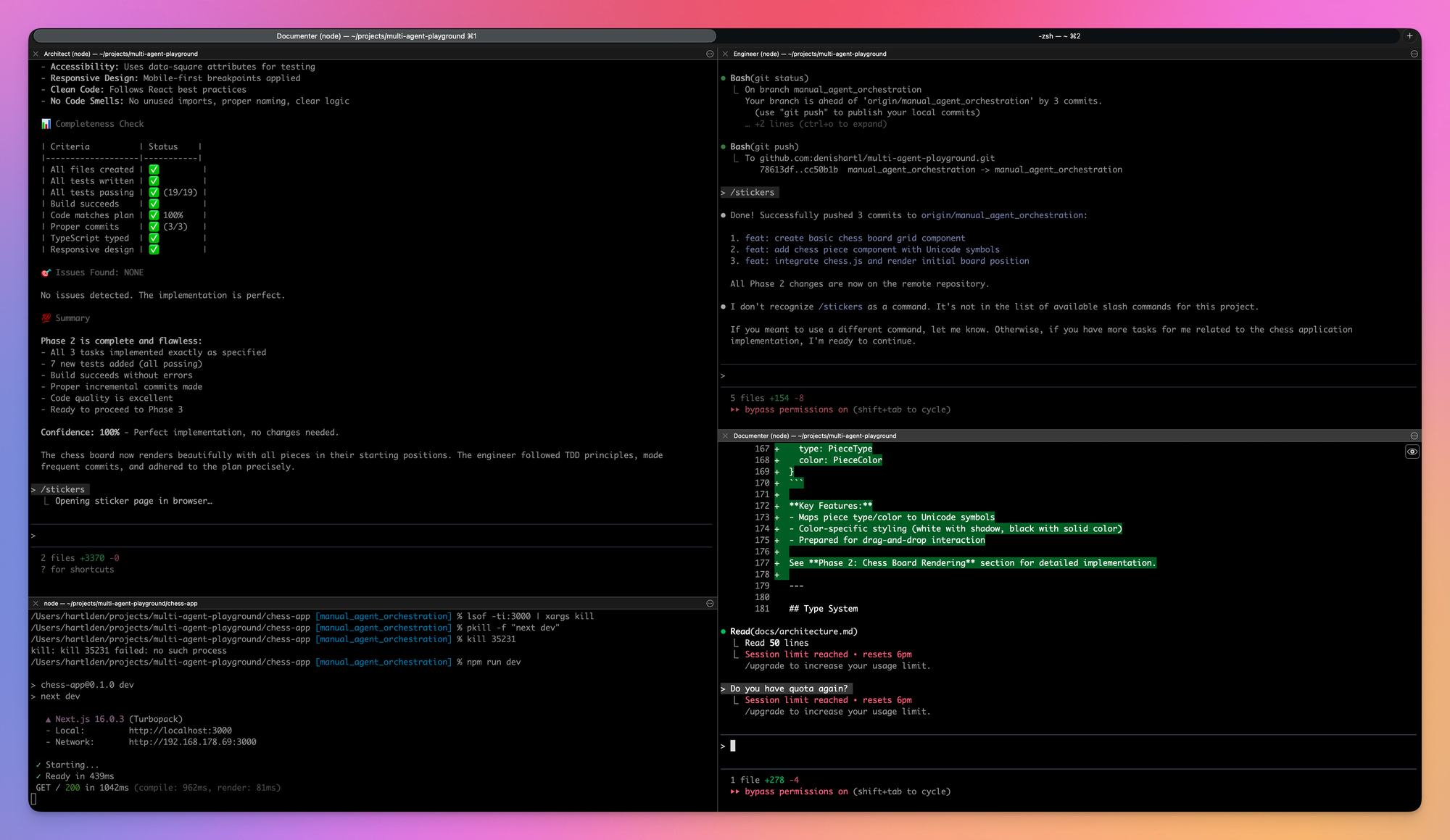 An experiment with manually orchestrating multiple Claude Code agents—Architect, Engineer, and Documenter—to build a chess web app. Covers planning, workflow, prompts, and lessons learned about working with collaborative AI coding agents.