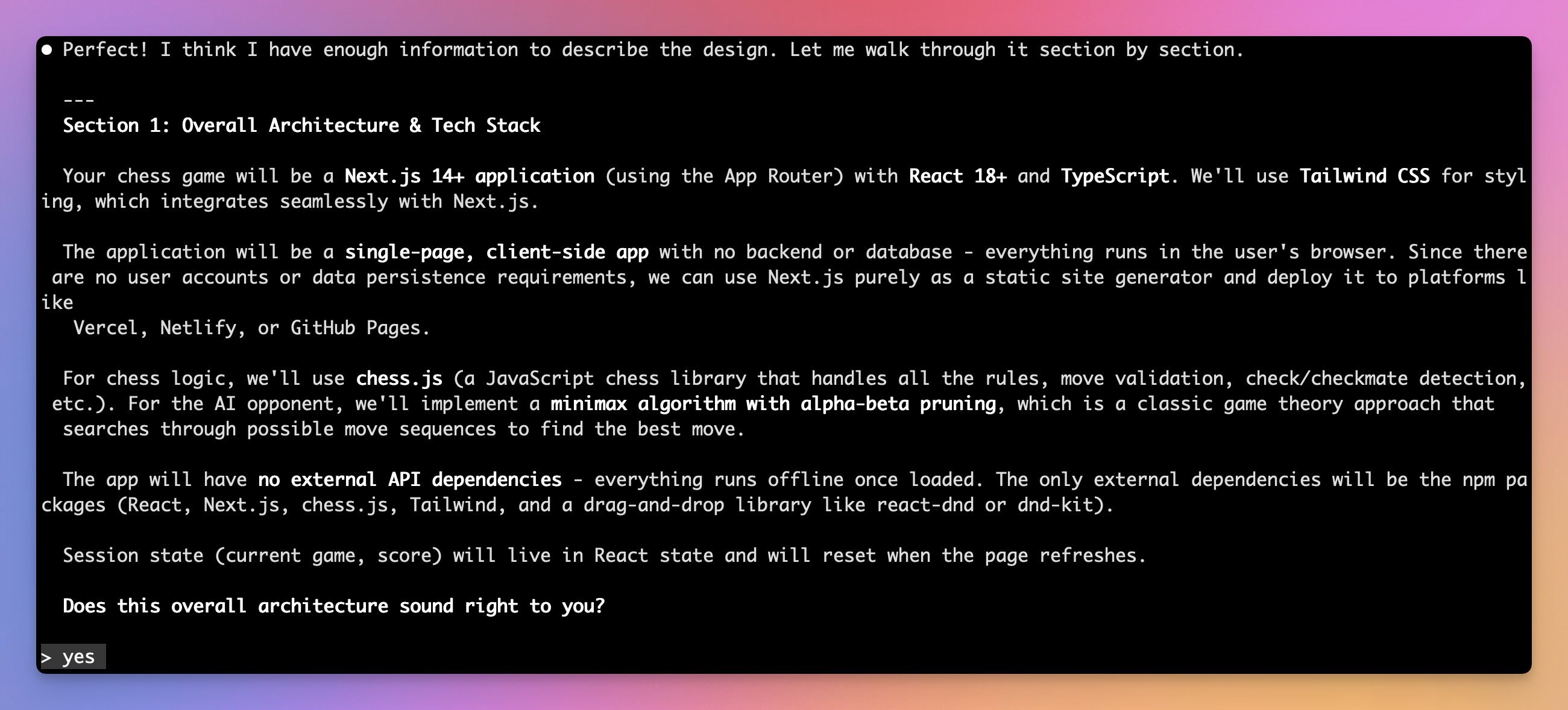 Once you believe you understand what we're doing, stop and describe the design to me, in sections of maybe 200-300 words at a time, asking after each section whether it looks right so far.