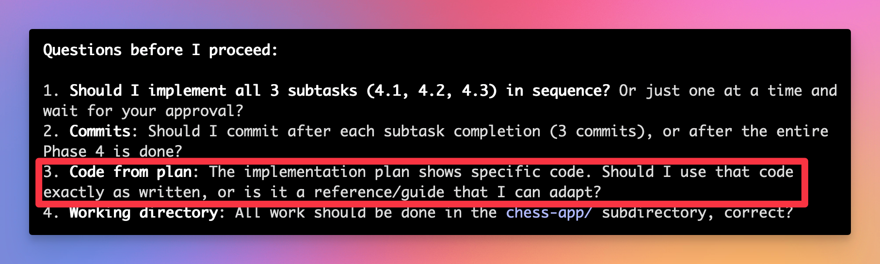 At this point, I was both both impressed and skeptical. I was really impressed at the scale and amount of detail of the plan. I was also very skeptical, as I thought there is NO way, that Claude actually thought of everything – the whole file and directory structure, every file, every commit, etc. – before implementing anything. Like NO WAY. But I decided to stick with it and see where this goes.