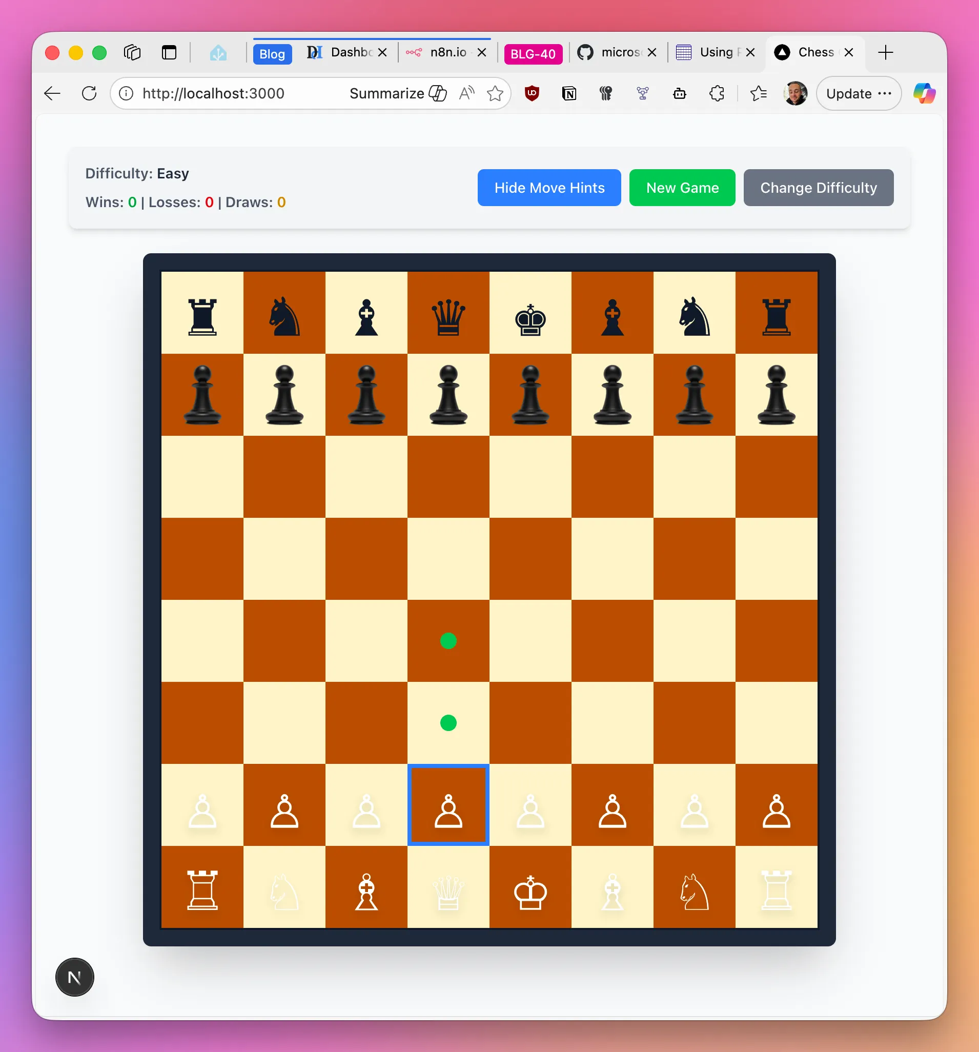 clean and responsive, working well on both desktop and mobile devices. Additionally, I want to include a feature that highlights possible moves for the selected piece to assist beginners. Finally, I want to implement a simple scoring system that tracks wins, losses, and draws