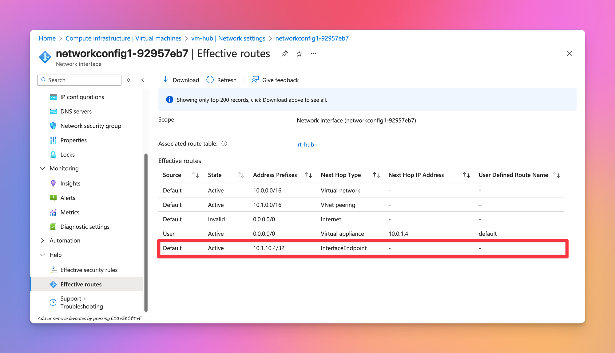 When checking the effective routes on the VM located in the hub VNET, it shows a direct /32 route to the Private Endpoint in the peered VNET.