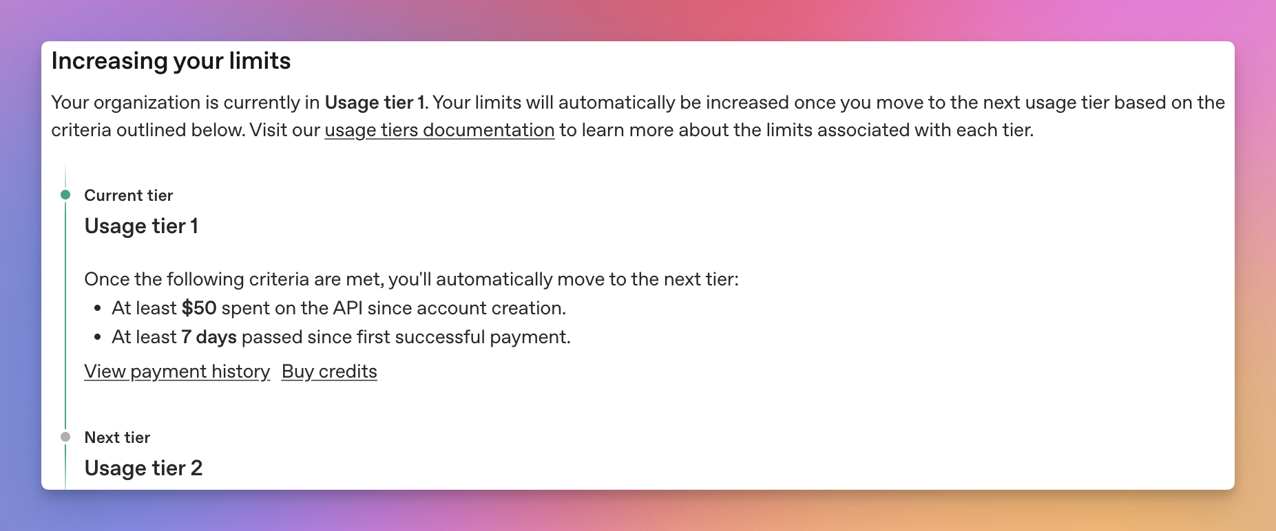 You can find further information about usage tiers here: https://platform.openai.com/docs/guides/rate-limits#usage-tiers